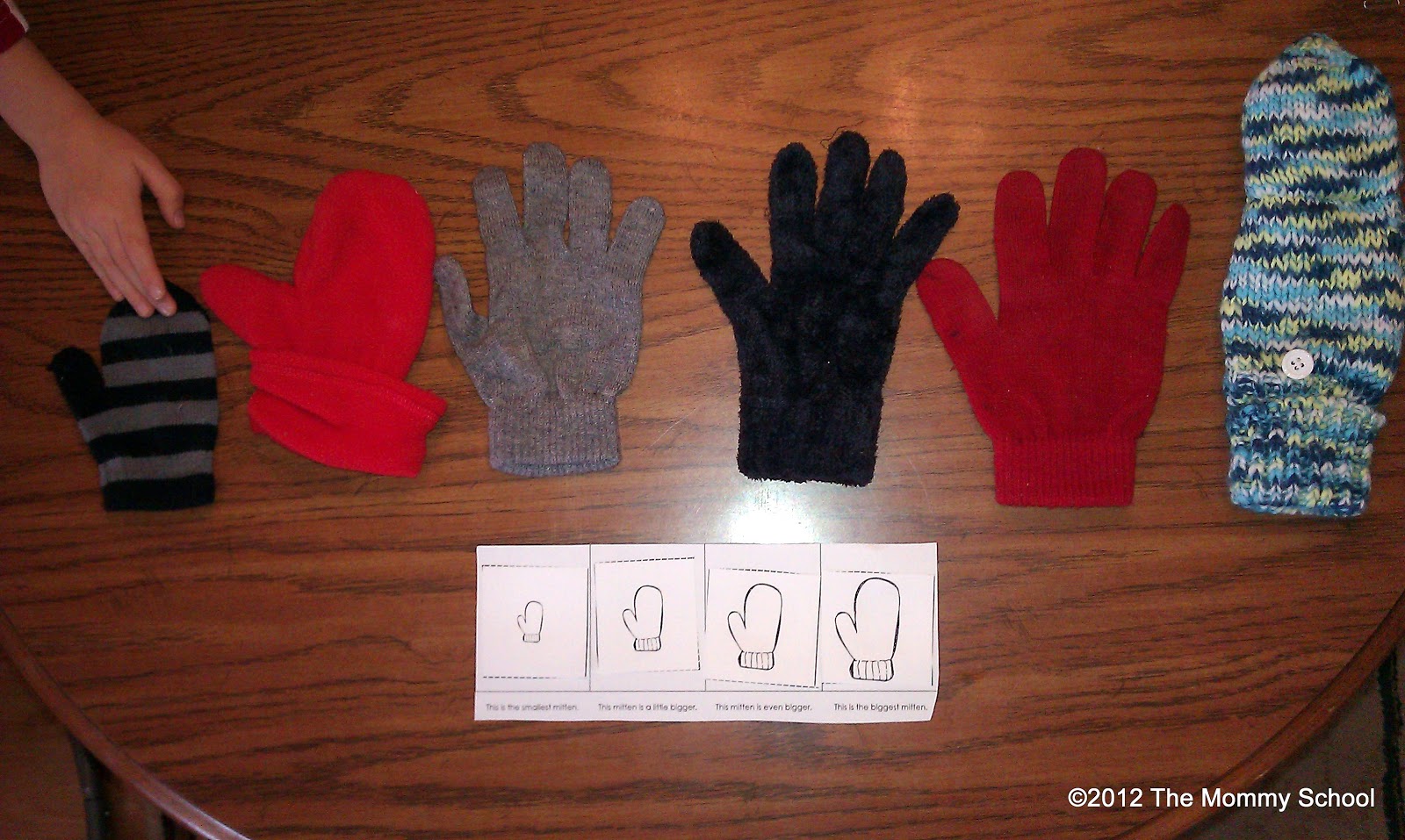 Next, we started some of the lapbook activities (from Homeschool Creations). The first was differentiating left and right mittens. And then, we arranged mittens from smallest to largest. I thought it would be fun to use some of our mittens/gloves to do the activity as well.